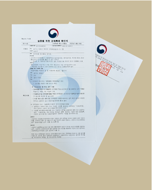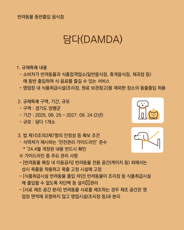 저희 매장은 반려동물과 함께 편안하게 머물 수 있는 공간을 꿈꿉니다. 카페에 들러 커피 한 잔 하실 때도, 식사 자리에 앉으실 때도, 소중한 반려동물과 함께할 수 있어요. 모두가 기분 좋게 머물 수 있도록 몇 가지 작은 약속만 지켜주시면 됩니다.